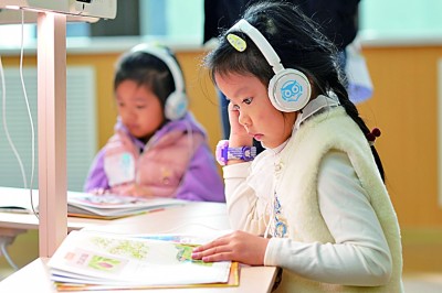 山东青岛,小朋友在阅读馆体验AI阅读。新华社发